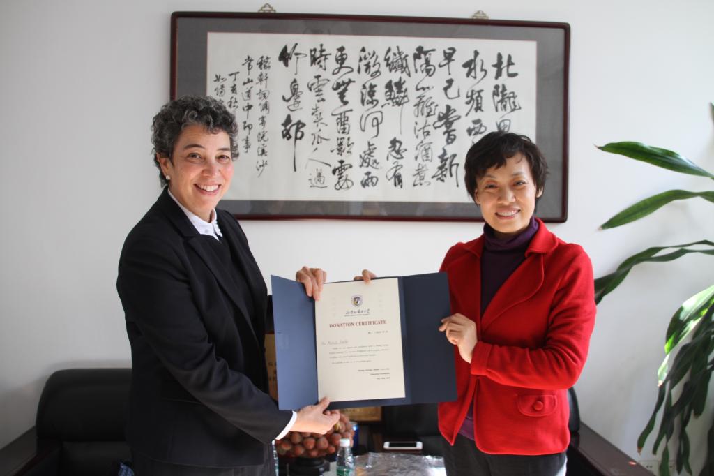 Keating女士向胡书记介绍了自己曾经贷款求学的经历,希望通过捐赠的形式,帮助高翻的寒门学子顺利完成学业。胡书记代表高翻学院向Keating女士颁发捐赠证书,感谢她对高翻贫寒学子的关心和支持。
