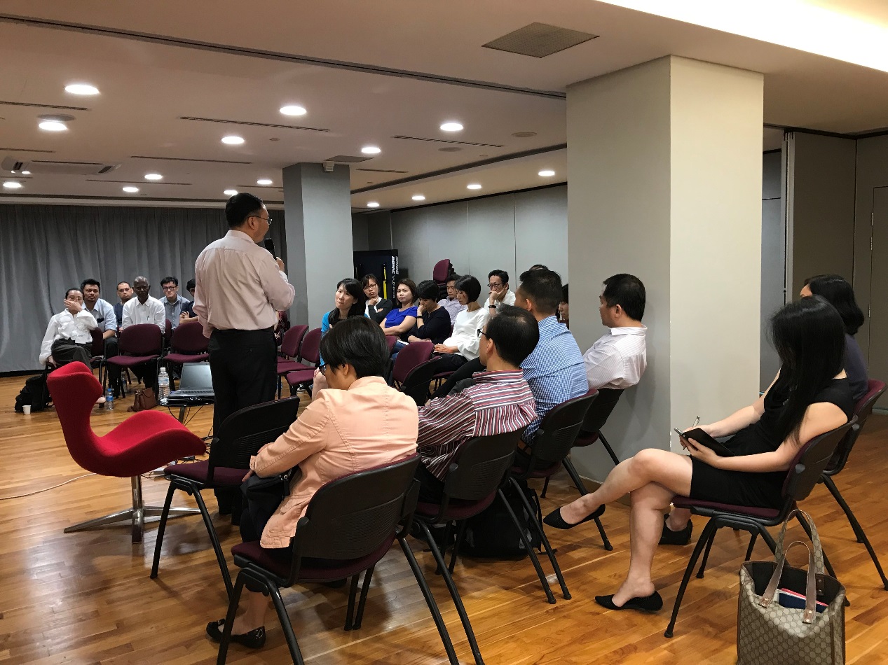 26日下午,李长栓教授在新加坡通讯及新闻部翻译处与该处20位华文、马来文和淡米尔文专职译员以及来自全国翻译委员会、新加坡国会秘书处、新加坡报业控股集团(Singapore Press Holdings)、新传媒 (Mediacorp) 和通商中国的翻译同行和翻译爱好者共计30人分享了北外高翻学院的翻译理念。