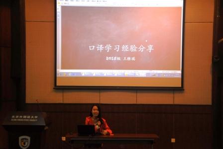 首先上台分享的是复语的钟超男学姐,她主要讲了在研一的紧张生活中如何把英语的学习和小语种的学习结合起来,找到一个适合自己的平衡,她着重强调的是,每个人的情况都不同,在高翻最忌讳的就是亦步亦趋,盲目地被别人牵着鼻子走。她说一定要按照自己的实际情况来安排自己的学习,不要整日把时间浪费在纠结和焦虑中。同时,她还强调学霸的生活里不应该只有学习,平时一定要注意锻炼身体,强健的身体才是革命的本钱。