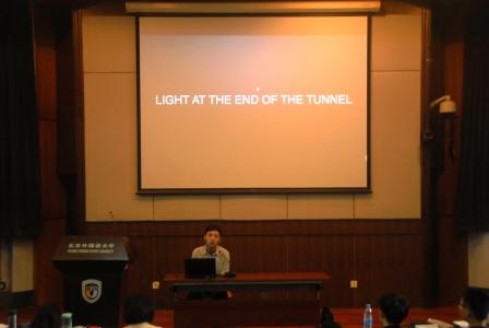 第二个上场的是陈阳学长。他首先以自己被周老师批得遍体鳞伤的作业作为开场白,强调分数is more than a number,我们必须要从分数中看到更深层的东西,这样才能逐渐进步和提高。他给学弟学妹们的建议是Don’t be afraid of problems, and be grateful to the problems pointed out。