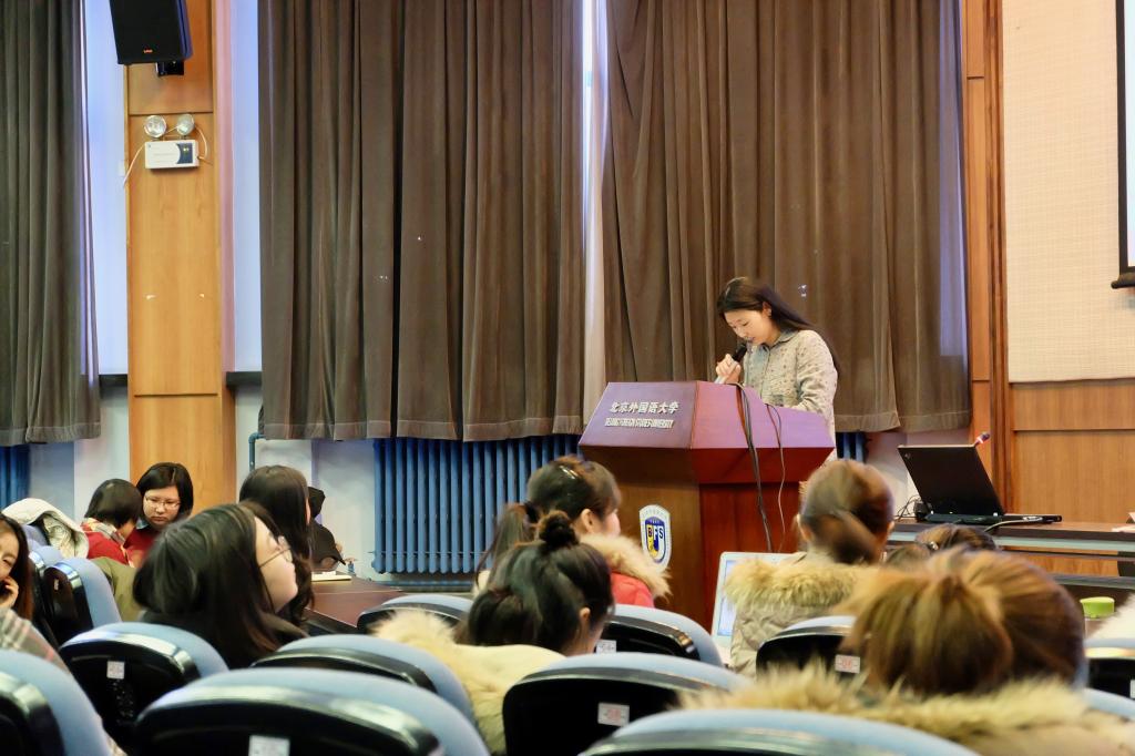 来自职业生涯工作坊的李雪菲同学在报告中总结了小组一年来的主要活动及成果,通过沙盘心理活动、模拟面试项目、就业信息发布等工作,职业生涯工作坊的组员们有效帮助同学准确进行职业定位,做好充分就业准备。周澄瑜同学作为组长,介绍了心理协会进行的一系列工作,包括集体职业生涯咨询、心理辅导、团体建设等,初步达到帮助同学减轻心理压力,自信面对生活的目标,也希望在未来不断扩大师生的参与度。社会实践小组的组长李雪怡同学介绍了该团队负责的第二课堂成绩整理、校友录整理、东花市社区非遗项目的立项和天使义卖活动,多样化的社会实践项目极大丰富了高翻学院师生的课余生活。张梅娟同学在汇报中总结了海棠社过去一年的工作成果,海棠社旗下翻译团队、文创产品设计团队和考研一对一辅导小组,目前已经实现盈利。口译大赛调研及品牌推广组的组长田雪芳同学为我们介绍了2017年北外高翻口笔译大赛的筹划及举办情况,为下一届大赛筹备提供了宝贵经验。