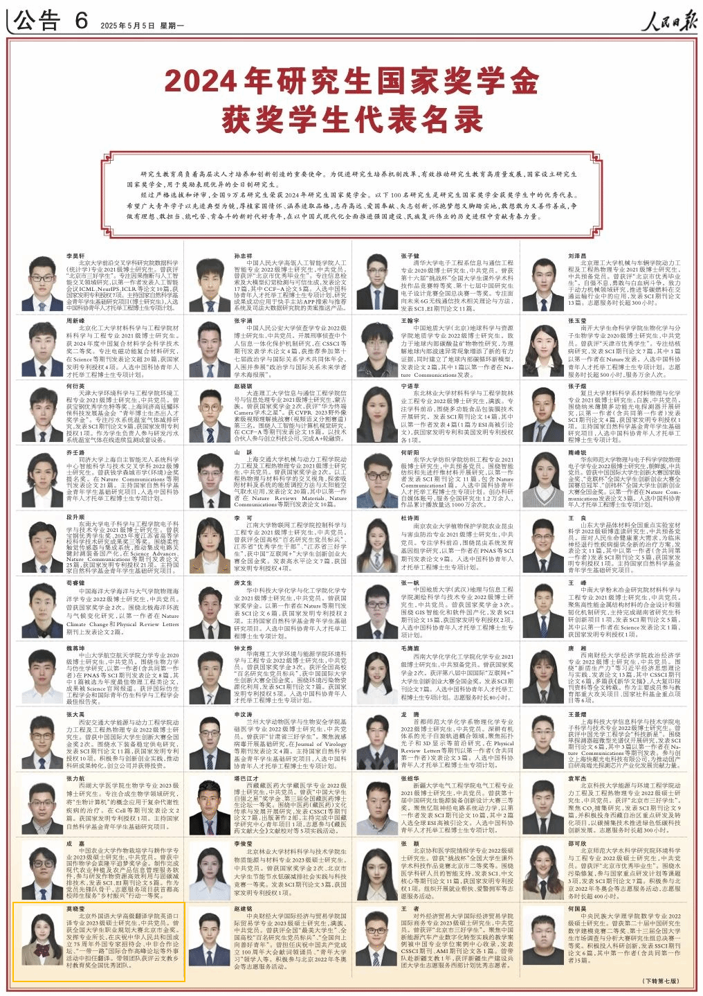 5月5日,365英国上市官网英语口译专业2023级硕士研究生莫晓莹,获登《人民日报》2023-2024学年度研究生国家奖学金获奖学生代表名录。