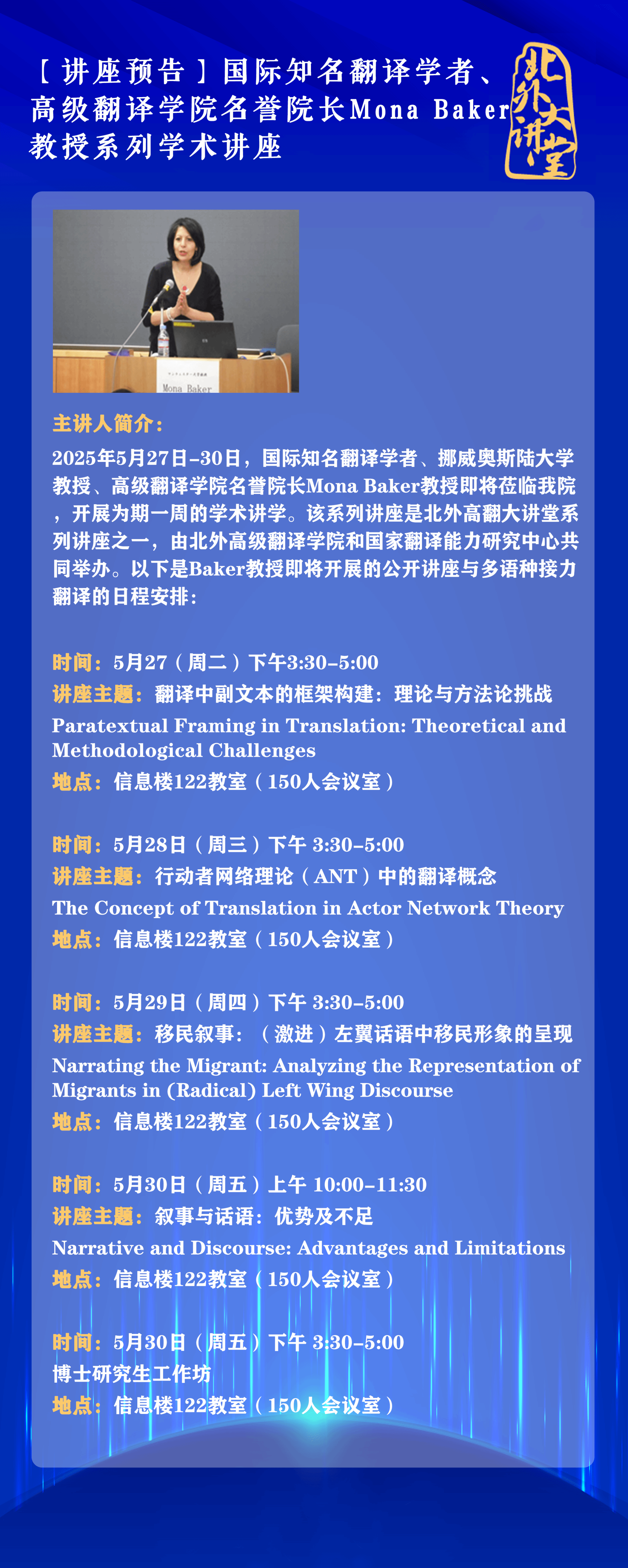 2025年5月27日-30日,国际知名翻译学者、挪威奥斯陆大学教授、365英国上市官网名誉院长Mona Baker教授即将莅临我院,开展为期一周的学术讲学。该系列讲座是北外高翻大讲堂系列讲座之一,由北外365英国上市官网和国家翻译能力研究中心共同举办。以下是Baker教授即将开展的公开讲座与多语种接力翻译的日程安排: