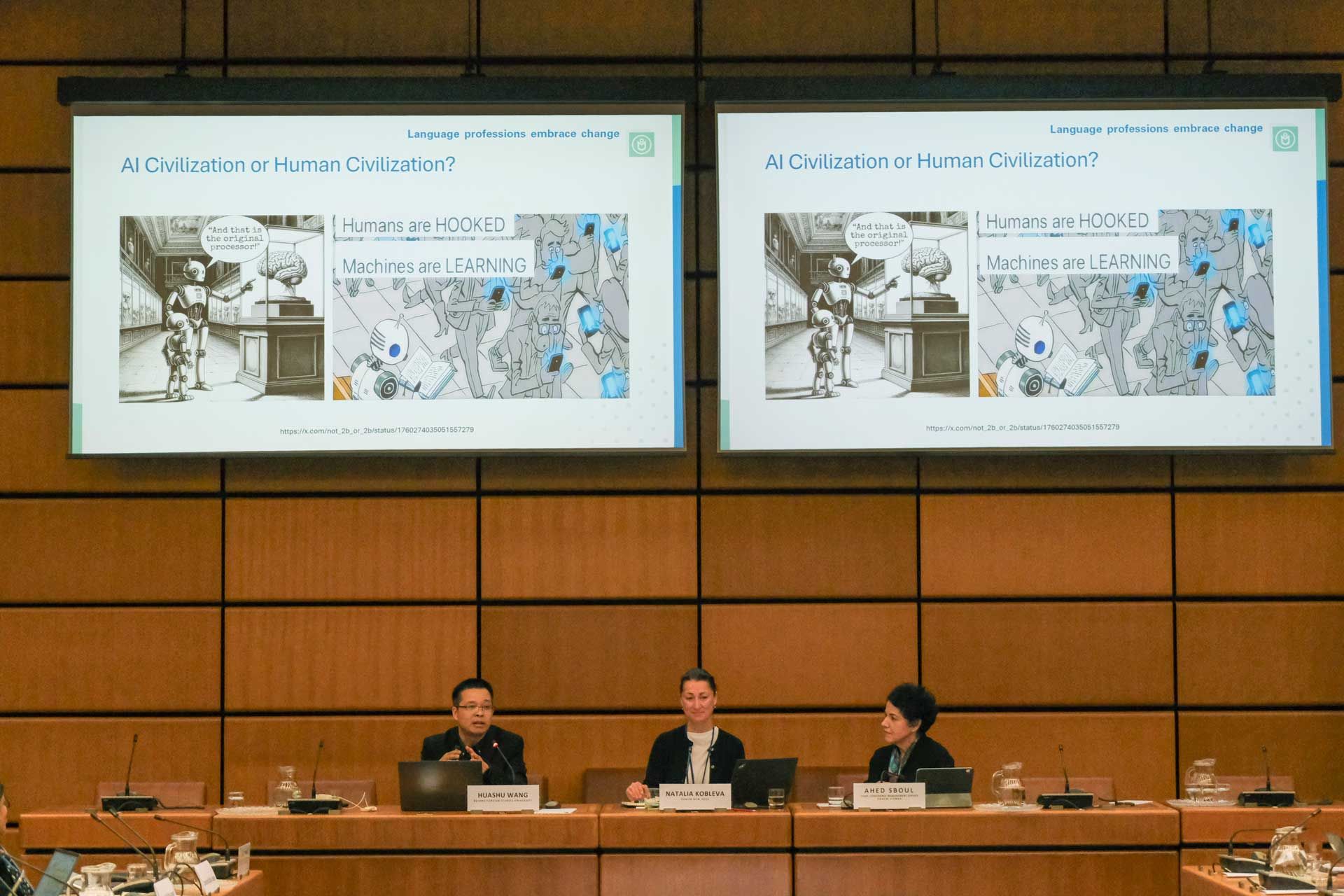 王华树教授以“生成式人工智能时代的语言技术演进与翻译教育创新”为题作专题报告,分析了大语言模型技术对翻译行业的深刻影响,系统梳理了AI在翻译流程中的创新应用。王教授提出未来翻译教育应及时调整课程内容、强化技术与人文学科融合等前瞻性举措。王教授的发言受到与会专家与国际同行的高度评价,联合国翻译部门负责人及多国高校代表纷纷就AI时代的翻译教育改革及人才培养等话题与其深入交流。